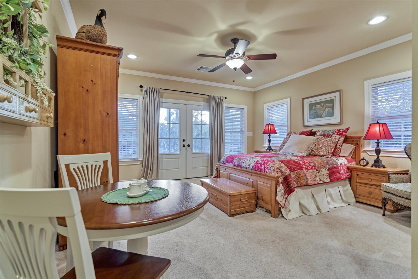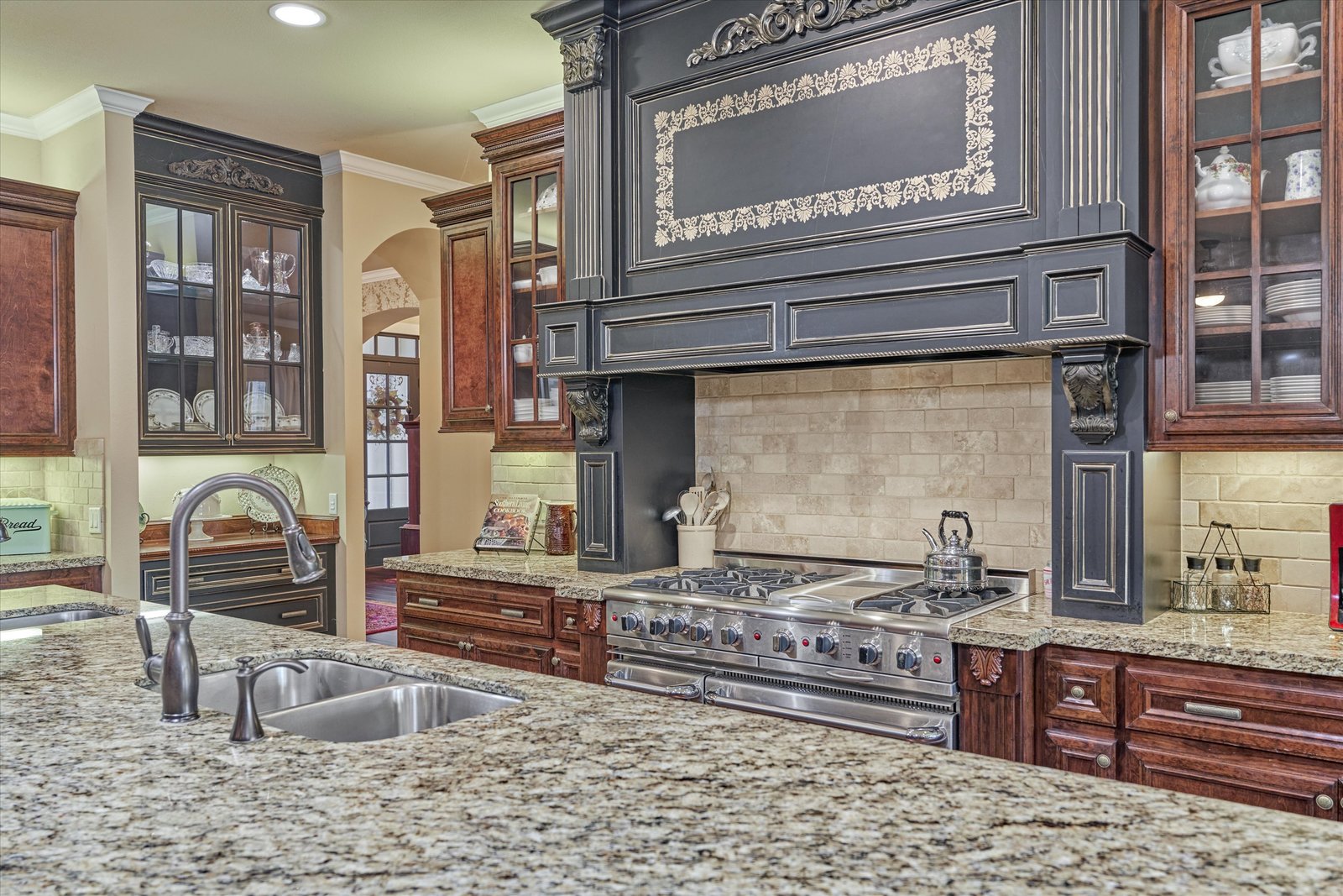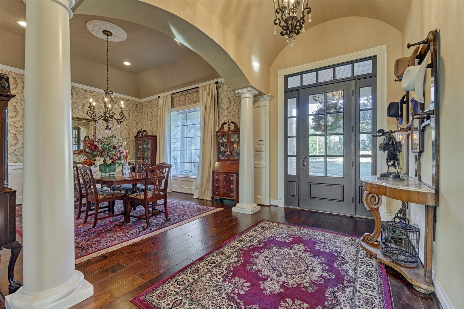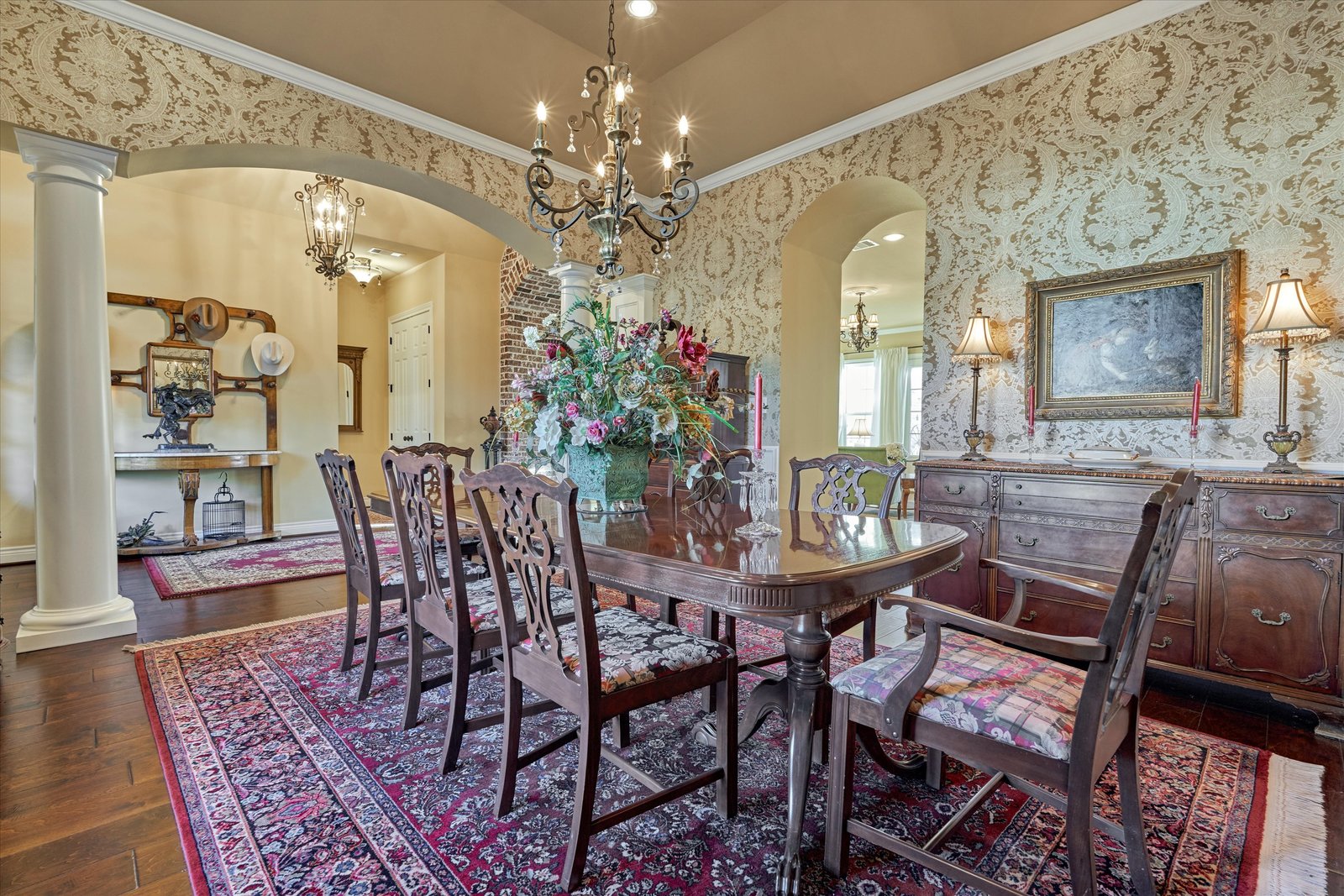 Step into timeless Southern grandeur at this one-of-a-kind residence, inspired by Jefferson Davis's historic Virginia home. Spanning two lots on a full acre, this estate offers 5 bedrooms, 5.5 baths and a 3 car garage, including a unique suite w/private kitchen, blending architectural elegance with modern, multi-generational living. Custom light fixtures, period-inspired wallpapers, rich colors, layered textures, and detailed millwork showcase the artistry behind this remarkable build. Modern conveniences include ensuite baths for each bedroom, two dishwashers, two washer/dryer stations, tankless water heaters, PEX plumbing and foam insulation. Outdoors, step out to a covered porch w/ a vaulted, wood paneled ceiling, Summer kitchen and cozy fireplace, driveway & security lighting and a gate leading to the community pond. This estate is a rare opportunity to own a true architectural treasure- where history inspired design meets modern comfort in flawless harmony.